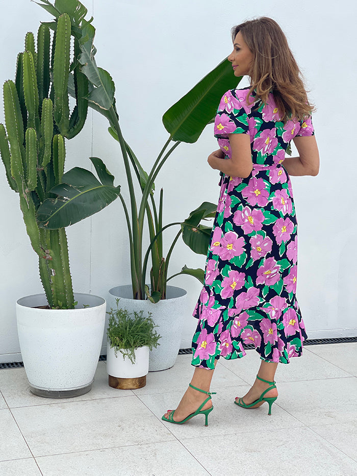 • Navy with purple and green floral print