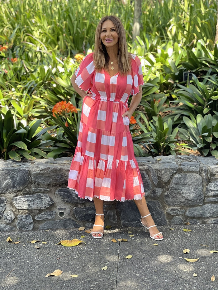 Midi Tea Dress - Coral Gingham
