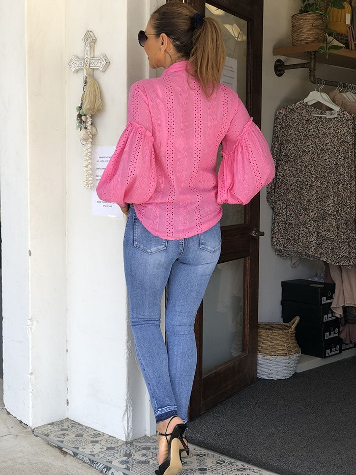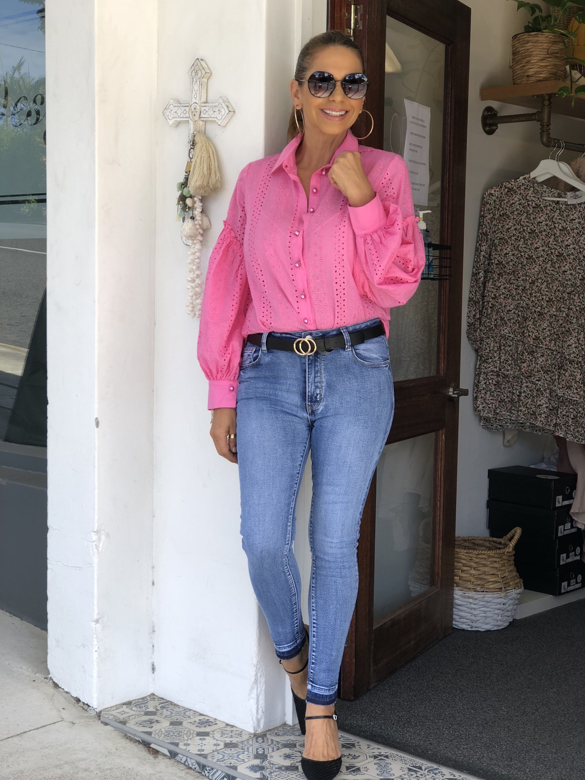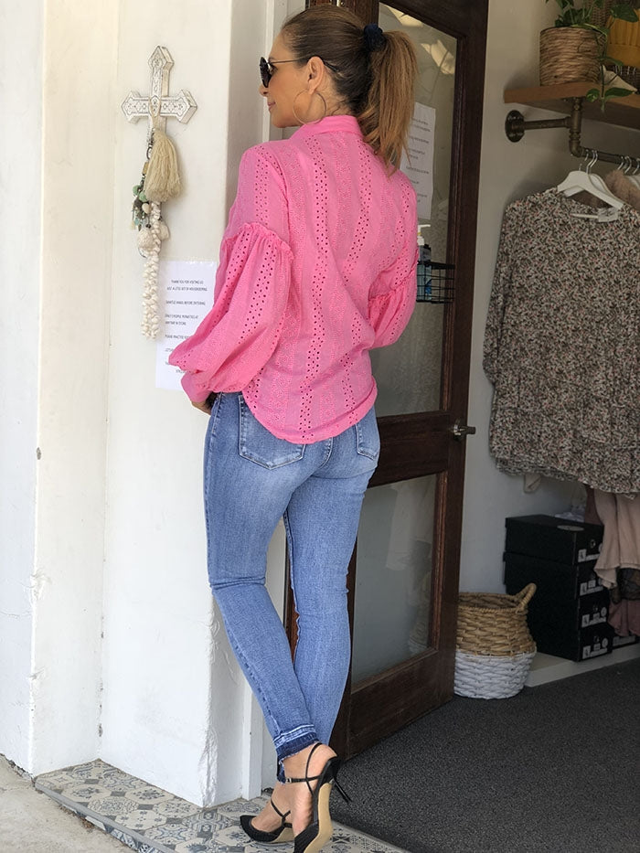 • Pink pearl button detail
